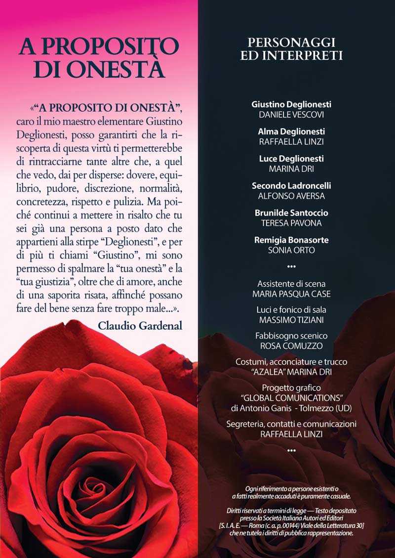 La Compagnia Teatrale “Oggi, Domani e Sempre…” è lieta di invitarti alla Commedia comica “A proposito di onestà” : una commedia in tre atti di una comicità irresistibile, scritta, sceneggiata e diretta da Claudio Gardenal.